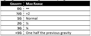 At 0G, or null-gravity, an attack with a kinetic ranged weapon or a thrown weapon is infinite. At 1G, normal gravity, the range is what is described for the weapon. At higher gravities, the range is halved per g.