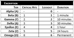 Tier and Lock: Encryptions are organized by tier, class, and lock. Higher the tier, the more difficult the encryption is to break. Higher the lock, the longer the lockout duration before another attempt can be made.
