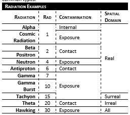 Radiation necrotizes flesh and can corrode or alter materials. When exposed to a certain radiation type, entities must succeed a Fortitude check. The type of radiation or the exposure itself will determine the check.