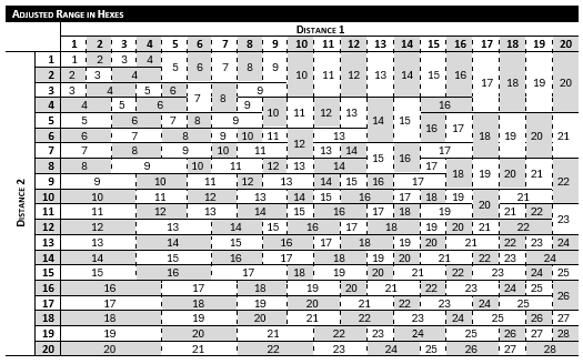 Diagonal movement is lateral movement through the plane with a corresponding change in altitude. This is easily achieved. Using the table, total the drive’s available thrust and find that value on the table. Any combinations of values below will give the lateral and horizonal movement in hexes.