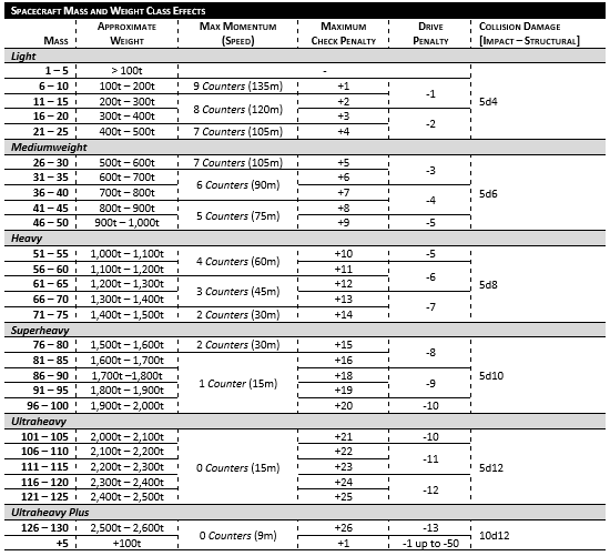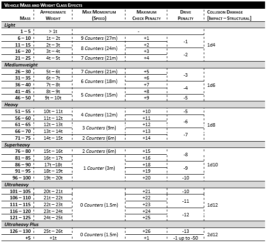 For example, a vehicle with a mass of 24 (light) has 15 momentum counters making the pilot check a d100 + 4 as +4 is the maximum check penalty for that Mass.