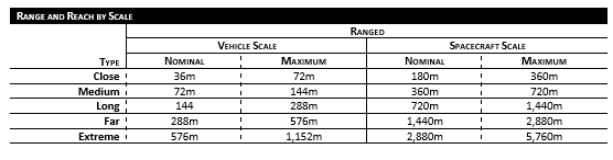 The range classifications are similar to that at Freelancer scale, however, due to the size difference, the weapon ranges are slightly different. With a +3 to the attack roll for every 2 hexes beyond the maximum range.