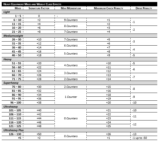 When attempting to maneuver or make any pilot checks, the Mass of the heavy equipment creates a penalty added to the die roll itself for each momentum counter beyond its max momentum up to the maximum penalty.